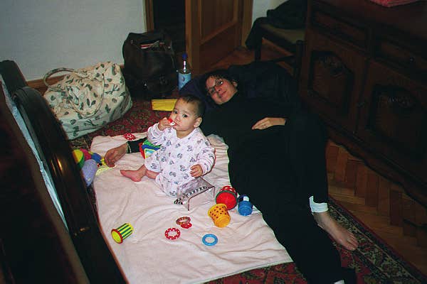 We were given a photo of Dana, a 2 minute video tape, and a very brief summary of her medical history. Despite the minimal information, we knew almost immediately that we would accept Dana's referral. She looked at us on the video and smiled and laughed and melted our hearts. And to top it off, the medical information described Dana as being "affectionate" - a description that has proved itself over ten-fold. But we spent a few days learning every thing we could about Dana and talked to a doctor specializing in adoptions from Russia and Kazakhstan and were happy that we didn't find any surprises. So, on Friday we accepted the referral and committed ourselves to the journey to come. We were told to make sure that we got ourselves to Moscow by the following Saturday.