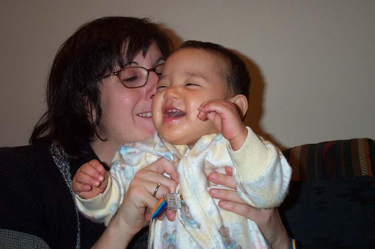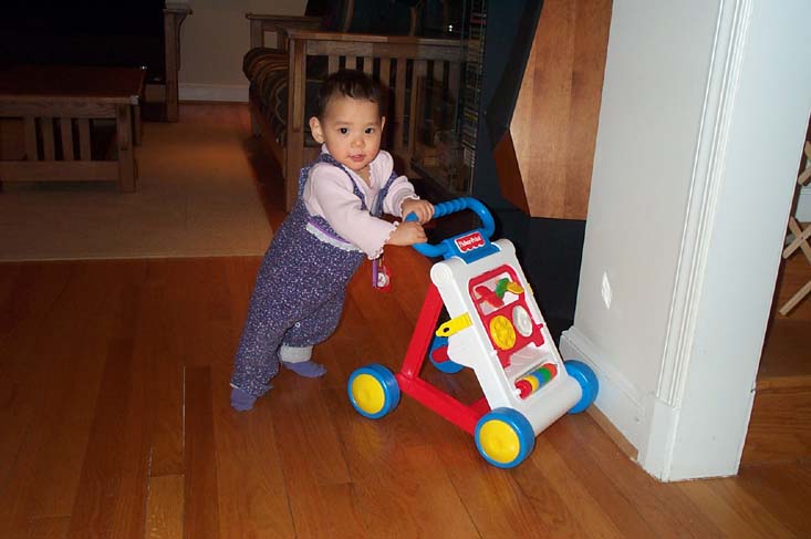 Dana said her first word on Friday, Jan 28th - "pop". I always say "pop" when I take out her pacifier. I was changing her diaper in the evening, and she looked up at me, pulled out her pacifier, smiled and clearly and distinctly said "pop". Now, she practices saying it all the time. At least we didn't have to fight over her saying dad before mom!