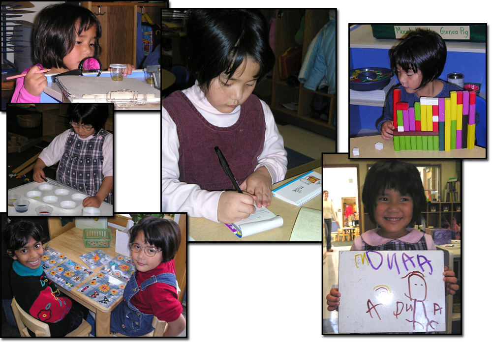 Dana spent a second year at the Center for Young Children (CYC), a wonderful school (3-6 years old) at the University of Maryland. Her interests are evenly split between art, science, dramatic play, reading/writing, blocks, and just about everything there. She has made some really great friends - especially Alana (bottom-left).